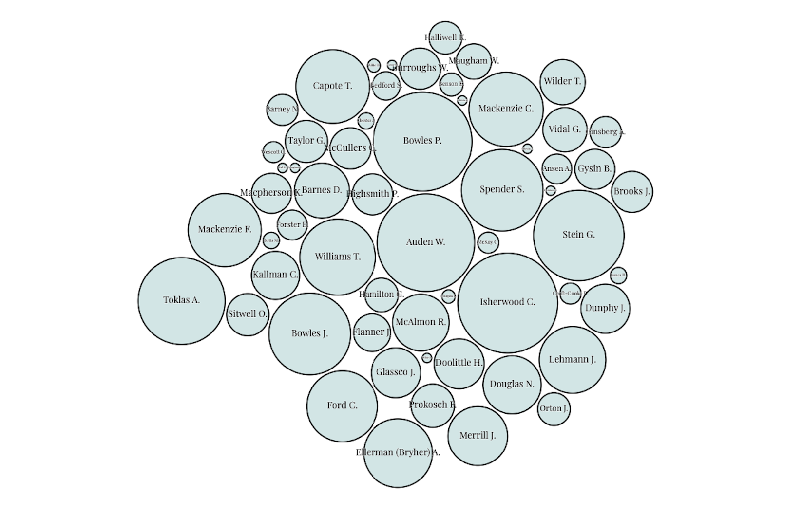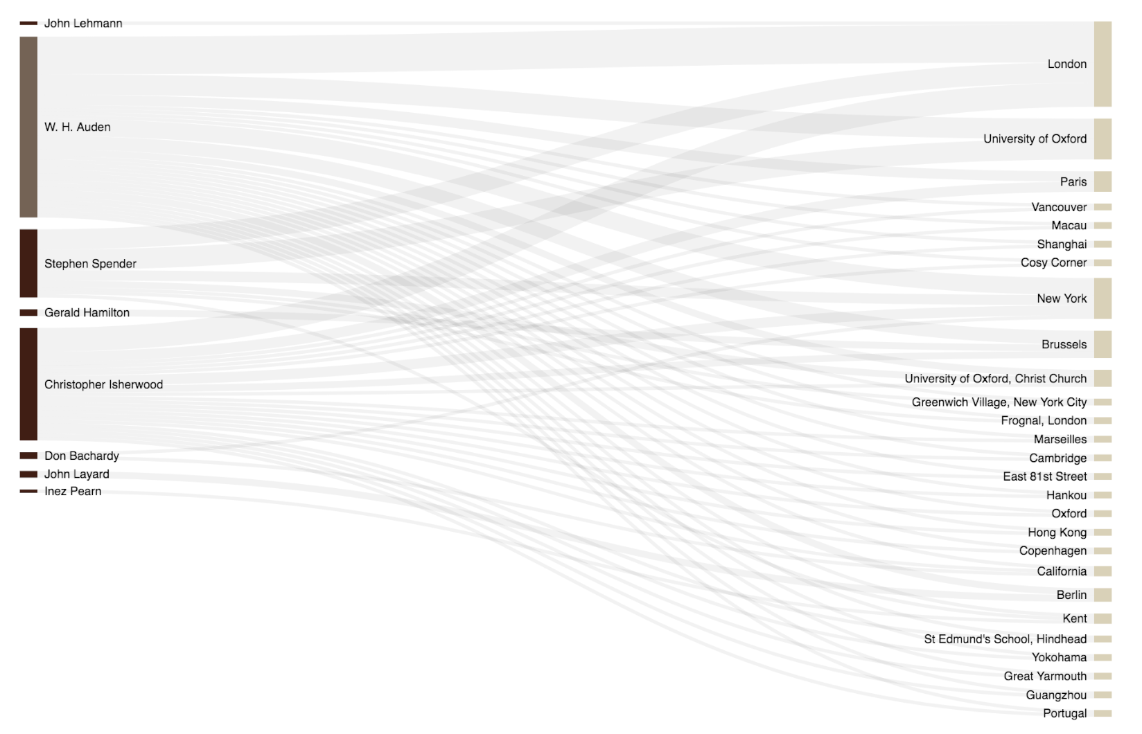 The selected timeframe of 1900 to 1969 for this network covers a period in which intense legal pressures were placed on LGBTQ+ people.Show note on historical context.The platform tracks the migration of LGBTQ+ exile writers during the decades before the gay liberation movement, a time when many people were forced out of the United States and the United Kingdom due to the criminalization of homosexuality.Read more.